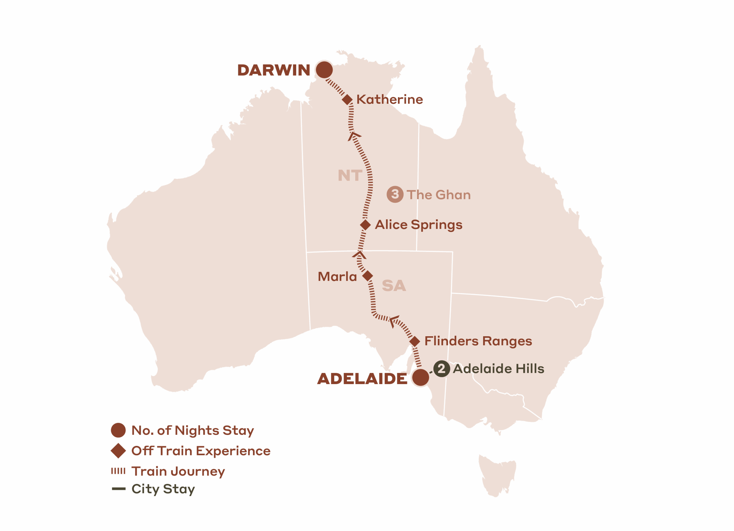 - 3 nights aboard The Ghan, Adelaide to Darwin, including all meals, beverages and Off Train Experiences in the Flinders Ranges, Marla, Alice Springs and Katherine