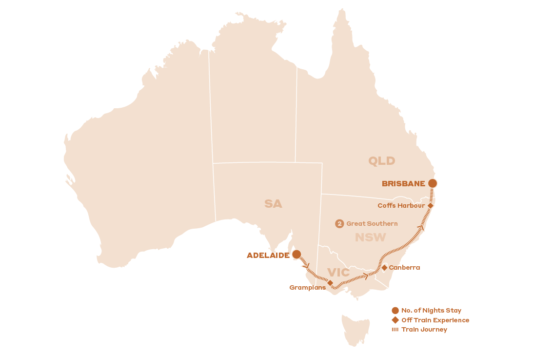 - 3 days / 2 nights aboard the Great Southern, travelling from Adelaide to Brisbane