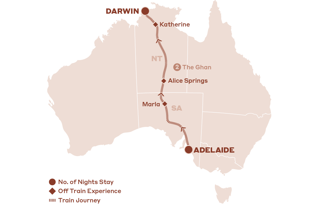 - 3 days / 2 nights aboard The Ghan, travelling from Adelaide to Darwin