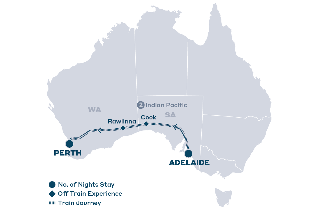 - 3 days / 2 nights aboard the Indian Pacific, travelling from Adelaide to Perth