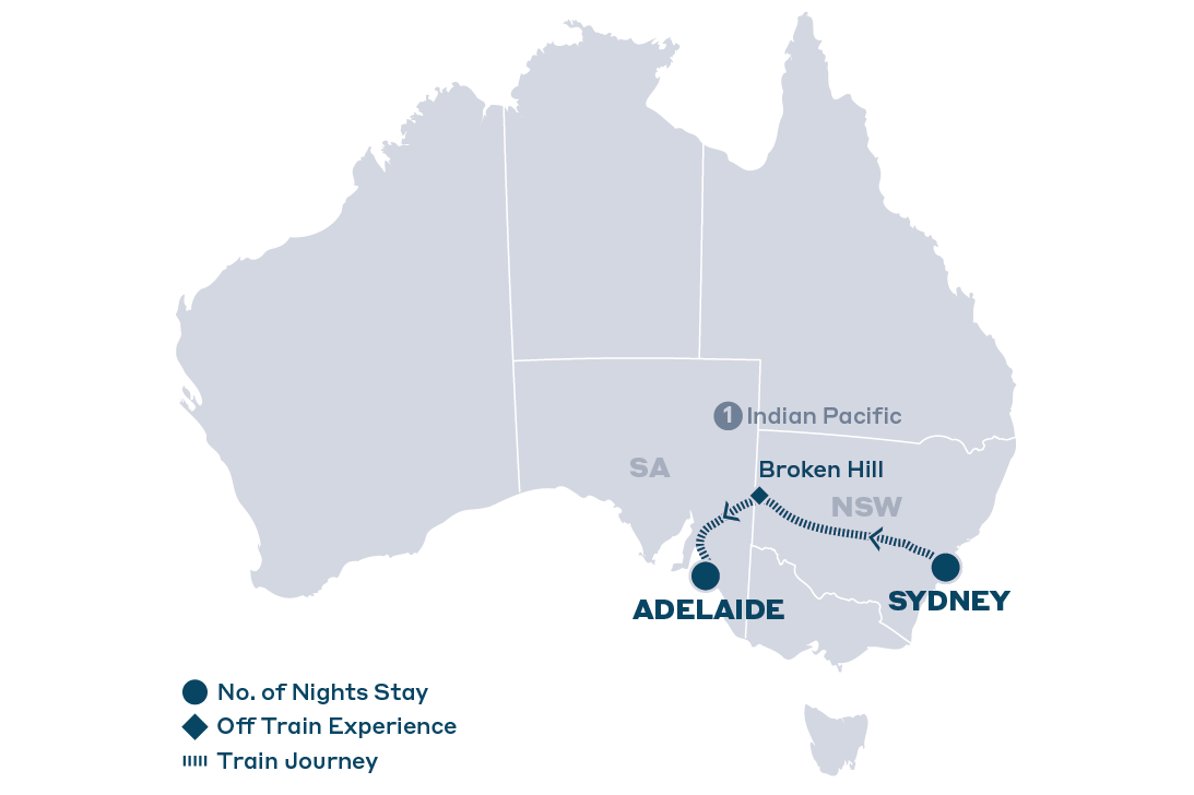 - 2 days / 1 nights aboard the Indian Pacific, travelling from Sydney to Adelaide